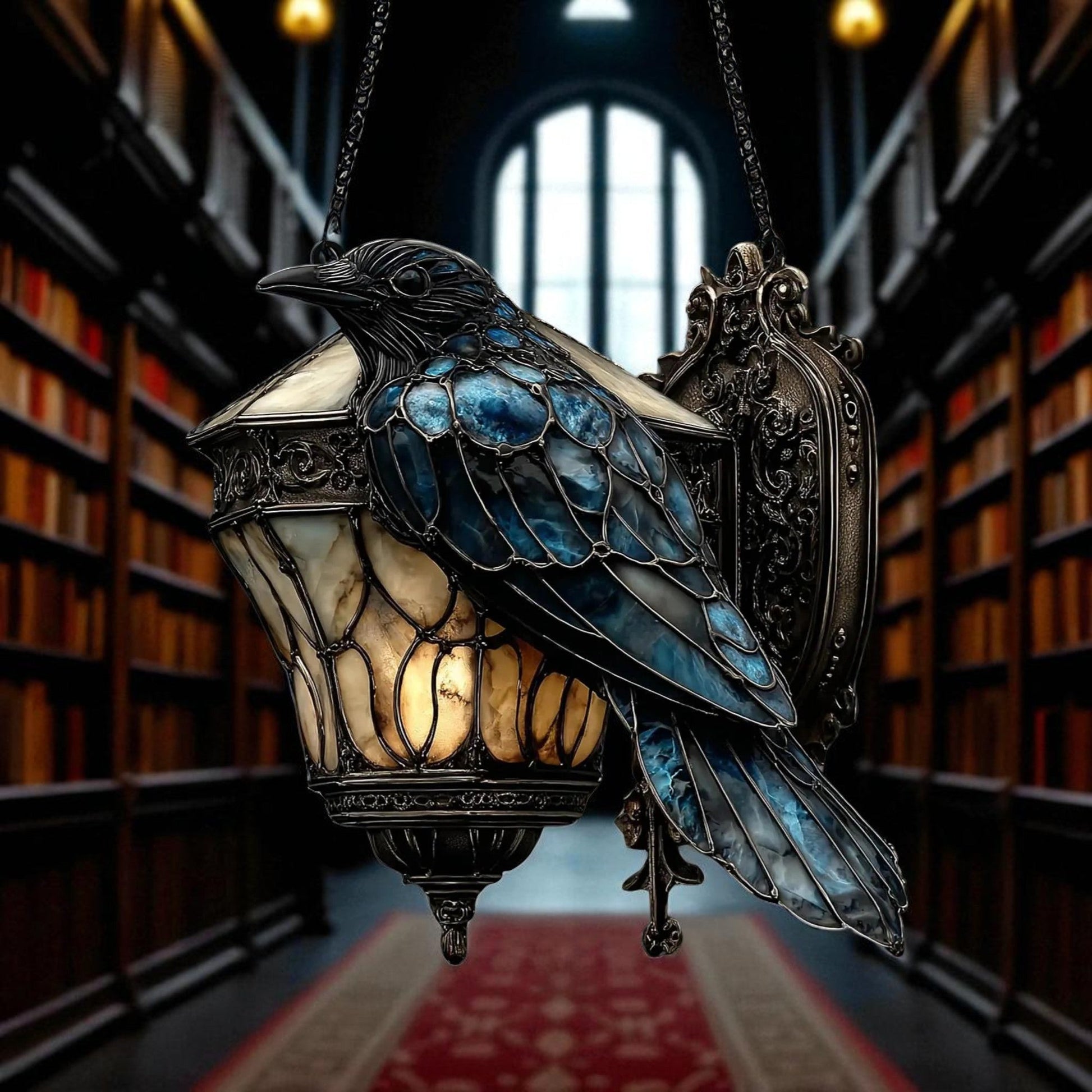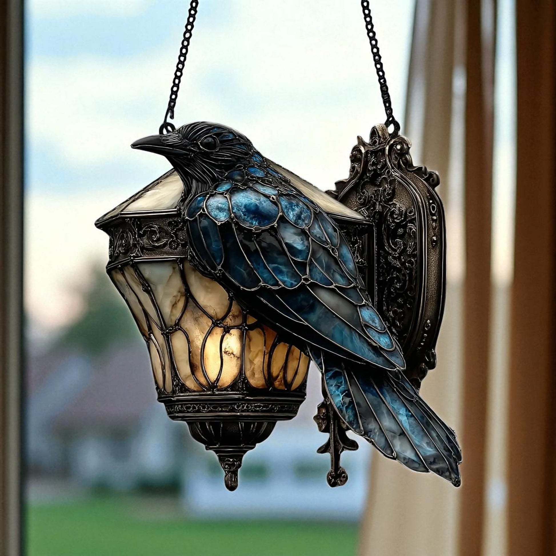 Raven Gothic Lantern Acrylic Suncatcher – 2D Faux Crow on Lamp Halloween Window Hanging, Dark Academia & Spooky Home Decor